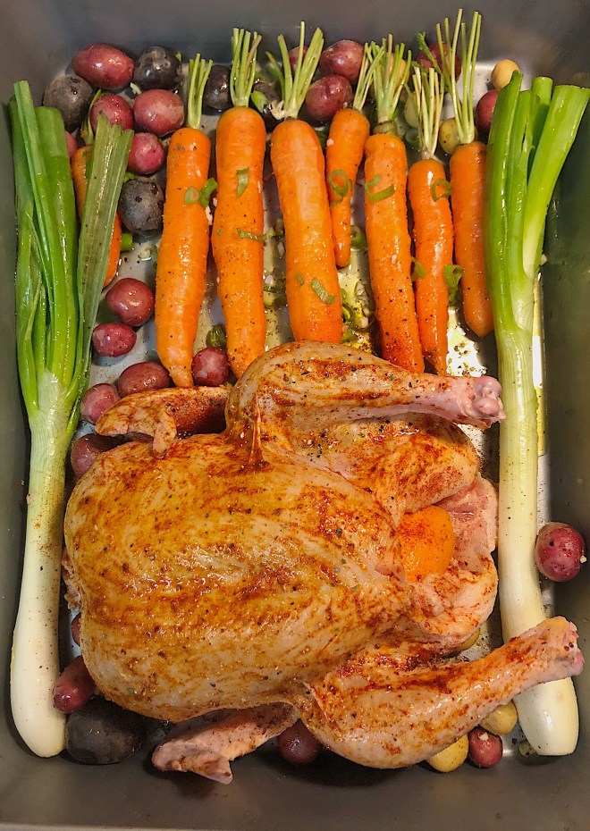 While the chicken is cooking, to prepare the Ranchero Sauce, bring a large pot with the chicken stock, chopped vegetables & seasonings to a boil. Simmer down to a low to medium boil for about and hour. Continue to salt and pepper to taste, adjust seasonings to preference. I typically play around with the sugar depending on the taste of the tomatoes, if the sauce is a little tangy, I will add a tsp of sugar to counteract the tanginess until it’s leveled to my preference.